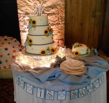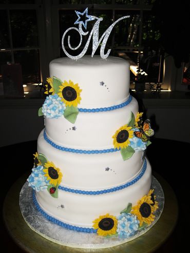 You will notice the butterfly in the photo of me with one of my custom made wine stoppers (above). The icon I designed for my custom cakes and treats is based on my wedding (see photos below) which featured a butterfly and sunflowers. My favorite color is now blue, but it used to be yellow which inspired my wedding theme of blue hydrangeas and sunflowers. Don't be confused by the patriotic colors for the cake. We were married on the 4th of July so that was my surprise for our guests and to pay tribute to the special day on our special day. Yes, I did make my own cake lol (among many other things for my wedding). I know some think I may have been nuts to make my own cake but made sense to me given my passion for doing so 😊