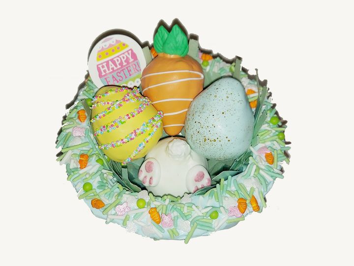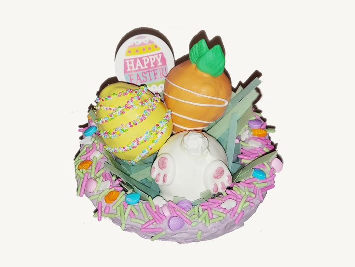 Easter baskets made of cake pop dough covered in chocolate coating with sprinkles around the edge. Inside of basket has edible grass made of wafer paper, and a variety of cake truffles (cake pop without the stick) - bunny bottom, egg, carrot and Happy Easter sign (sprinkles may vary based on availability). Baskets wrapped in clear bags tied with a ribbon on top. Personalized tag included.