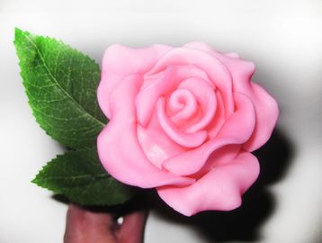 Cake pop in the center decorated with modeling chocolate petals. Artificial leaves added to complete the rose look. Rose head covered in a clear bag with curling ribbon for protection & transporting. Rose stem wrapped in tissue paper.