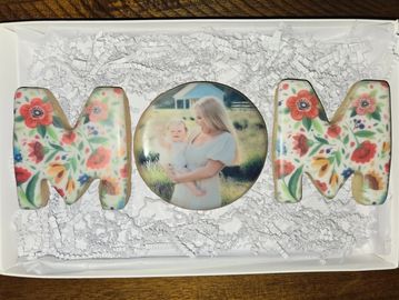 Three cookies to spell out "MOM" personalized with photo of your choice for personalized touch for the "O" in Mom.