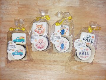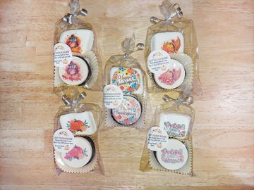 Oreo cookies hand covered in white coating with edible images on top. *Customization available (ie. variation on designs) Bags are tied with a curling ribbon on top with a twist tie.