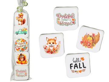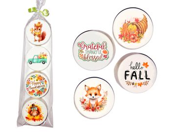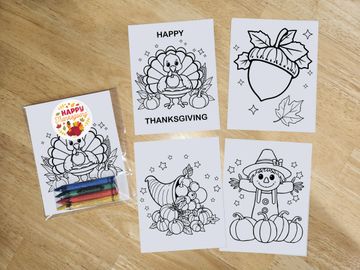 (4) Individual Thanksgiving coloring page sheets (4.25"x5.5") with pack of crayons. Choice of crayon colors (see below). Packaged in clear bag with themed sticker. Great for a special treat or gathering favors.
